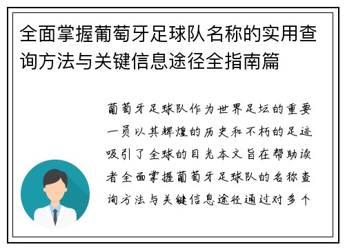 全面掌握葡萄牙足球队名称的实用查询方法与关键信息途径全指南篇